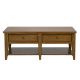 Enjoy family game night around the Lake House cocktail table. Crafted of poplar solids and oak veneers, this piece features an oak finish, appealing planked tops with additional wood and peg accents, planked bottom shelf, two push-through drawers accented by antiqued brass knob hardware, anchored by a tapered leg design. The golden oak finish allows for a universal appeal.