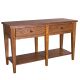 Accent your space with the casual country style Lake House sofa table. Crafted of poplar solids and oak veneers, this piece features an oak finish, appealing planked top, one planked bottom shelf, two drawers for additional storage, simplistic wood and peg accents, antiqued brass knob hardware, anchored by a tapered leg design. The golden oak finish allows for a universal appeal.