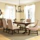 Armand, inspired by a 17 century French antique. Pulling in Tuscan elements for the dining the rectangular trestle table features heavy square turned bases. Square back, armless upholstered chairs feature linen upholstery with a nail head trim on the base of the chair. The buffet features 4 door panels with overlays and pilasters chamfered for a soft appeal. Cases feature overlays on the top drawers, framed drawer panels, block feet and chamfered posts. Media features drop down fronts so it can double as a small dresser with the landscape mirror for smaller spaces.