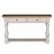 Elevate your space with the Morgan Creek sofa table. Crafted of poplar solids with pine and birch veneers, this piece features an antique white finish with spatter and watermark accents and a wire brushed tobacco planked top, appealing pewter nail head corner accents, and two full extension drawers with a bottom shelf for additional storage, anchored by round turned legs flowing into bracket feet. This gorgeous sofa table will bring a luxurious feel to any traditional space.