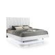 The Europa Panel Bed in white offers a perfect blend of modern elegance and quality craftsmanship. This set includes a panel headboard, footboard, two side rails, and four mattress support slats. Its sleek design is achieved with a majestic headboard, glossy white finish, and modern mylar accents, creating a sophisticated look. The eco-friendly manufactured woods are assembled with durability in mind, finished with a glossy white topcoat and padded upholstery for added comfort. Upscale extras include soft blue base lighting that reflects off the silver mylar bases, casting an ambient glow. This bed is the ideal choice for those seeking a luxurious and contemporary centerpiece for their bedroom.