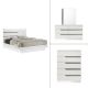 The Paradox 4 Piece Platform Bedroom Set in White is a stunning combination of contemporary style and functional elegance. This set includes a platform bed along with a dresser, mirror, and chest. The gleaming white gloss laminate finish offers a sleek, modern look and the added benefits of being scratch and water-resistant. Crafted from a mix of solid and manufactured woods, it ensures long-lasting durability. The platform bed design requires no box spring, providing a stable base for your mattress. Experience smooth drawer operation with fully finished drawers that offer snag-free storage and glide effortlessly on full-extension, ball-bearing slides. Adding to its luxurious appeal, the ambient LED lighting on the platform and headboard highlights the modern white finish and glittering silver mylar inlays. With a six-drawer dresser and five-drawer chest, this set offers ample storage space for all your clothing needs, making it a perfect blend of style and practicality for your bedroom.