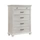 The Silver Sands Chest is built with durable, quality construction using solid pine, manufactured woods, and oak wood veneers, ensuring a strong and stable piece. Its transitional style blends clean, simple lines with a rustic wood finish, creating a calm and inviting atmosphere. The misty gray finish, applied through a meticulous multi-step process, offers a light, weathered look that highlights the natural grain and mineral patterns of the wood. Elegant design features, including a raised base, full return and dentil moldings, and contrasting hardware, add a sophisticated touch. Heirloom-quality drawers with dovetail joinery and three-stage steel ball glides ensure smooth, full-extension operation and can support heavy loads. With five spacious drawers, including a velvet-lined top drawer to protect delicates, this chest provides ample storage for clothing essentials. Combining style, durability, and functionality, this chest is a practical and elegant addition to any bedroom.