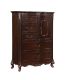 The Constantine Five Drawer Chest by Royal Classics is a masterful blend of elegance and functionality. This vertical chest, finished in rich Cherry, is crafted from a blend of Solid Pine and Fancy Face Birch Veneers, ensuring heirloom quality and enduring beauty. The laborious multi-step finish enhances the natural beauty of the wood, while burnished gold tipping on the intricate carvings adds a luxurious touch. The French Traditional design, featuring elaborate 18th-century Rococo style ornamentation, brings a touch of regal elegance to your home. The chest's drawers are built to last with French and English Dovetail Joinery, rolling smoothly on full-extension glides and featuring finished interiors for snag-free storage. Sophisticated touches include bowfront drawers, book-matched veneers, and cabriole legs, completing the lavish design. This piece combines traditional style with modern comforts, offering velvet-lined top drawers, cedar-lined bottom drawers, ample drawer size, and roomy storage behind the doors. The Constantine Chest is an exquisite addition to any bedroom, harmonizing opulence with practicality.