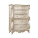 The Monique 5 Drawer Chest in Champagne combines heirloom quality construction with French Provincial elegance. Crafted from poplar solids and birch veneers, this chest offers enduring strength and durability. Its design reflects the charm of French countryside homes, featuring soft curved lines, intricate carvings, scalloped edges, and decorative moldings that add a touch of sophistication. The multi-step champagne finish, meticulously applied, enhances the natural beauty of the wood, while antique gold glazing highlights the moldings and ornamental carvings. The drawers, built with French and English dovetail joinery, glide smoothly on full-extension mechanisms and feature finished interiors for snag-free storage. Practical features include a velvet-lined top drawer, a cedar-lined bottom drawer, and ample storage for clothing in the spacious five-drawer chest. Combining traditional style with modern comforts, the Monique 5 Drawer Chest is a luxurious addition to any bedroom.