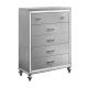 The Valentino 5 Drawer Chest in classic Silver is a testament to enduring craftsmanship crafted from a blend of manufactured and solid woods, adorned with exquisite embossed inlays. Radiating with glitz and glam, its gleaming finish, mirrored trims, crystal-studded drawer pulls, and alligator-embossed accents capture the essence of Hollywood allure. Delight in its thoughtful details, from heirloom-crafted English dovetailed drawers with snag-free interiors to smooth full-extension ball-bearing glides. With an abundance of storage, this chest offers ample space to organize your clothing and belongings effortlessly. Experience luxury and functionality combined in this distinctive piece—a must-have addition to any bedroom sanctuary.