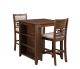The small space friendly Gia Counter Storage Table and Chair Set has a built-in shelf unit that provides the ideal spot for dinnerware or kitchen essentials. The dining table and chair legs are crafted of solid Rubberwood to add strength and stability. Mindi veneers on the table top and chair offer beautiful wood grain patterns that are enhanced with a multi-step rich cherry finish. The result is a cozy, traditional counter dining set that ideal for dining rooms, kitchen nooks, dorms or game rooms. Comfortable counter height chairs feature 100% light brown polyester seat cushions and chair backs, and wood footrests. The final touch is Gia's signature interlocking chain design on the chair back, giving this welcoming dining set a touch of sophistication.