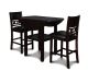 The small space friendly Gia Counter Drop Leaf Table and Chair Set has two 8" drop down leaves that transform this dining table from a 42" round dining set to 24" wide, fitting into compact spaces with ease. The counter table and chair legs are crafted of solid Rubberwood to add strength and stability. Elegant reverse diamond Mindi wood veneer dining table top accents the beautiful wood grains which are highlighted by the multi-step deep dark brown finish with touch of red for richness. The set includes two comfortable counter height chairs with black pu upholstered seat cushions and backrests, and wood footrests. The final touch is Gia's signature interlocking chain design on the chair back, giving this welcoming dining set a touch of sophistication. The result is a casual, contemporary counter dining set that ideal for dining rooms, kitchen nooks, dorms or game rooms.