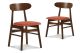 The New Classic Morocco Dining Chairs are a picture of Mid-Century Modern design with tapered legs, curved oval seatbacks, and classic walnut brown color. Easy care, orange 100% polyester foam cushions provide comfortable seating. A perfect accent chair in any room.