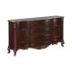 The Royal Classics Constantine Sideboard / Server in cherry combines heirloom craftsmanship with functional elegance, making it a refined addition to any dining room. Expertly crafted from solid pine and premium fancy face birch veneers, this piece ensures lasting beauty and durability. The multi-step finish enhances the natural wood grain, while delicately burnished gold tipping highlights the intricate carvings, adding a touch of luxury to its design. Inspired by 18th-century Rococo style, the sideboard features ornate ornamentation and carvings that bring a sense of regal sophistication to your home. The genuine marble top follows the furniture's graceful curves, while bowfront drawers and cabriole legs complete its lavish look. For practical use, the sideboard offers three velvet-lined drawers for flatware, spacious open shelving behind doors for bulkier items, and additional drawers for table linens or hosting essentials—making it both elegant and versatile, perfect for organizing and showcasing in style.