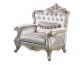 The Monique Royal Classic Arm Chair in champagne showcases heirloom-quality craftsmanship and timeless elegance. Expertly constructed from premium pine solids and adorned with durable polyurethane carvings, this chair is lightweight, moisture-resistant, and pest-resistant, ensuring long-lasting beauty and functionality. The elegant 100% polyester velveteen fabric, adorned with a refined Fleur-de-Lis pattern, graces the crystal button-tufted backs and cushions. Complemented by a tasseled bolster pillow, this accent chair exudes luxurious sophistication. Traditional Victorian styling, with intricate detailing, ornate carvings, and plushly tufted backs, creates an elegant Victorian feel. Curved lines and elaborate design elements enhance its sophisticated look, making it a striking centerpiece for any living room. Indulge in opulent comfort with luxurious high-density foam backs and premium pocket coil cushions that offer unparalleled support and exquisite relaxation. For added convenience, the chair back is shipped unattached, allowing for easy maneuvering into your home, and can be securely assembled in just 15 minutes. This accent chair promises to elevate your living space with its refined style and comfort.