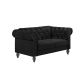 The New Classic Emma Chesterfield Velvet 2 Seat Sofa Loveseat is a blend of soft elegance and sophisticated design. Crafted from 100% polyester velvet fabric, it offers cozy and indulgent seating for two. The glam tailoring features tufted backs and arms adorned with glimmering crystal buttons, adding a touch of luxury without compromising comfort. Upscale accents, including silver nailhead trim on the rolled arms and silver turned bun feet, enhance the black velvet fabric. Shipped unassembled for easy placement in any home, its lower profile height makes it small space-friendly, fitting well into smaller rooms while providing full-size seating. Enjoy supportive seating with full foam cushions that provide ample comfort. Add a little sparkle in your home with the Emma Loveseat.