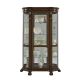 Museum-quality display options are at your fingertips with this well-scaled curved side curio in your home. The back of this tall curio cabinet sits flush against your wall to maximize visual impact without taking up too much floor space. The sides are curved maximizing the view of the mirror-backed interior. The single door opens from the front and is framed with ornate woodwork. Once the door is opened, it reveals five interior shelves to display your treasures. A handsome chocolate maple brown finish gives this unique curio cabinet both beauty and gravitas, and a brass-mounted canister light at the top keeps your collections in the spotlight.