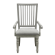 A great dining experience requires a great chair. This one borrows from traditional designs and updates them with a buff gray finish that lets the wood grain show through. Turned front legs and the slat back hark back to gathering around a great farm table and padded upholstered seats provide comfort and support. Arms are beautifully shaped with a knuckle detail.