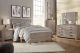 A sophisticated modern chunky look with large satin nickel colored hardware. Warm gray vintage finish with subtle pearl effect over replicated cherry grain. Mouldings across headboard give a thick planked look. Side roller glides for smooth operating drawers. Drawer interiors finished with a replicated linen design. Slim...