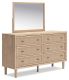 Clean-lined and contemporary—but far from stark—this dresser with mirror is a fresh style awakening. Pairing a light finish with replicated oak grain and textured beige details that replicate the look of cane, its mixed materials bring a naturally versatile vibe to your bedroom. Prepare to have your mind blown by the vast universe of possibilities that await within the spacious drawers. Whether you're prepping for work or getting ready to hit the town, the mirror will have you looking fabulous from every angle.