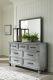 What's old is what's new with this dresser and mirror. Serving up a fresh look in urban-farmhouse style, the eclectic dresser features a light weathered gray finish with dark aged bronze-tone bar pulls and metal straps for a casually cool sensibility. Profiled drawer frames, thick-profiled top moulding and tapered legs are the earmarks of timeless design.
