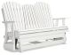 Drift away from everyday worries and into outdoor bliss with this glider loveseat. Dressed in a crisp white, the Adirondack-inspired design has a classic feel. It weathers sunny summer days and cozy winter nights with durable MEGA-TUFF® HDPE material. A drop-down console with integrated cup holders keeps refreshments and snacks within easy reach. With the console snapped into the back, this loveseat has even more room for enjoying lazy days in the shade.