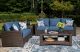 Brown resin wicker woven on an aluminum frame. High performance Nuvella fabric. Stainless steel hardware. Two throw pillows included with loveseat and sofa.